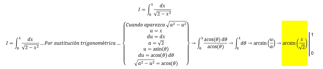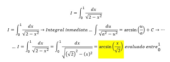 En mis intentos intentó forzar un arc sin, pero ya sea porque haga mal el cambio de variable {hago t^2= x^2/2; x=[(2)^1/2]t] y dx=(2^1/2)dt} ó a la hora de sustituir los nuevos límites tras el cambio de variable que me quedan 0 y 2^1/2. No consigo el resultado.