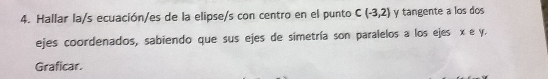 Buen dia. Necesito que me hechen una cuerda con este ejercicio. Lo que no entiendo es, como plantearlo.Lo unico que hize fue graficar el centro, y coomo dice que la conica es tangente a ambos ejes,entonces la distancia del centro a los puntos de tangencia..podria ser a o b.Pero no entiendo bien como plantearlo.Gracias
