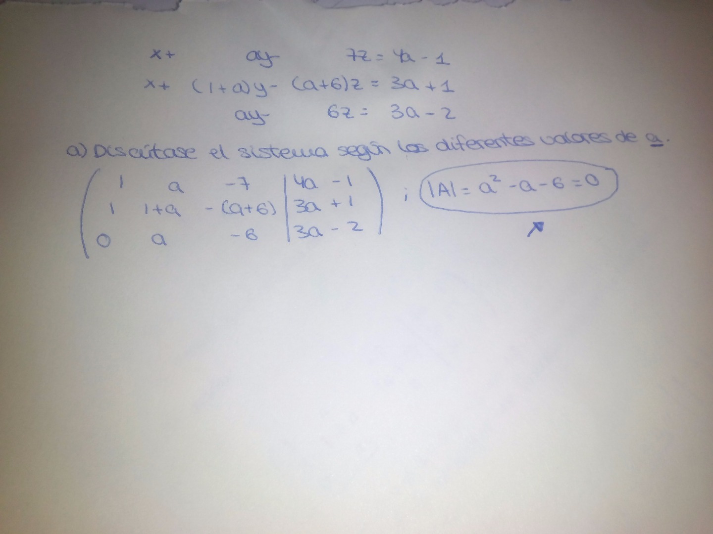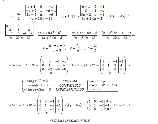 ¡Hola! Tengo problemas al sacar |A| para discutir los sistemas según los diferentes valores de un parámetro. Sé sacar la matriz y continuar el ejercicio cuando tengo |A|. Ojalá podáis ayudarme