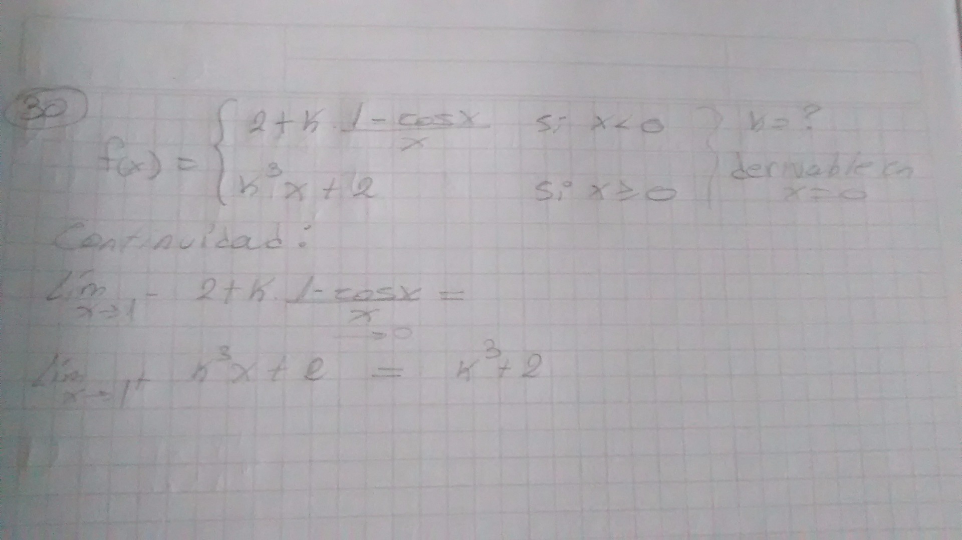 Buenas es la primera vez q pregunto en un foro, pero quisiera saber si me pueden ayudar con este ejercicio sobre derivabilidad, se los pasos pero me cuesta plantearlos en diferentes problemas. En este caso me pide el valor de K para que sea derivable en x=0