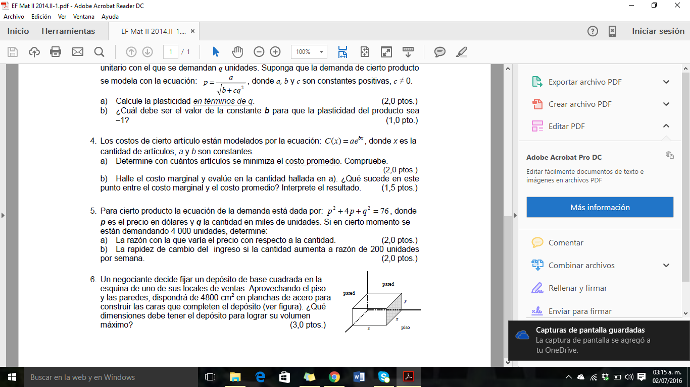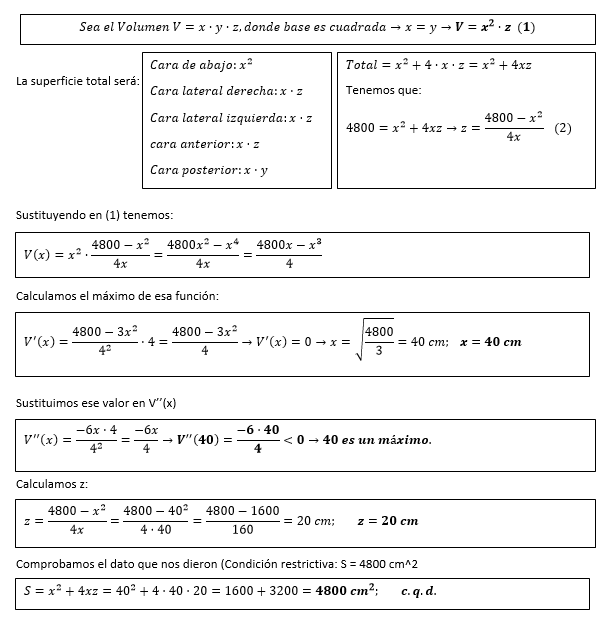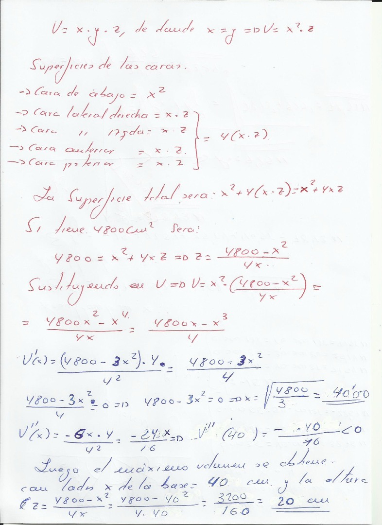 S= x²+4·x·z=40²+4·40·20=1600+3200= 4800 cm², que es la condición restrictiva del ejercicio. Nota: He hecho el ejercicio considerando el depósito completo sin tapadera. mañana, si Dios quiere, te lo envío aprovechando paredes y piso. Un Saludo.