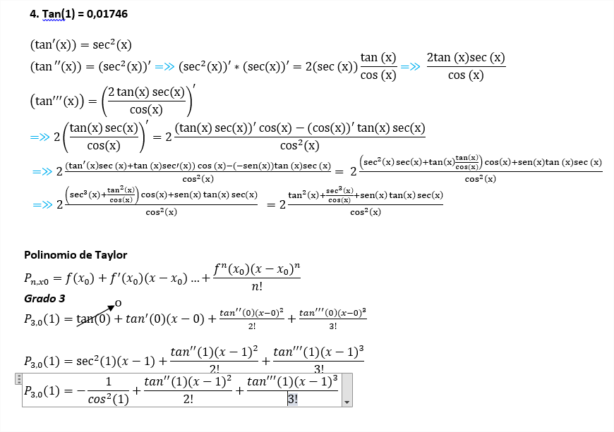 4. Halle el polinomio de Taylor de grado 3 de la función f(x) = tan(x) iniciando en x = 0