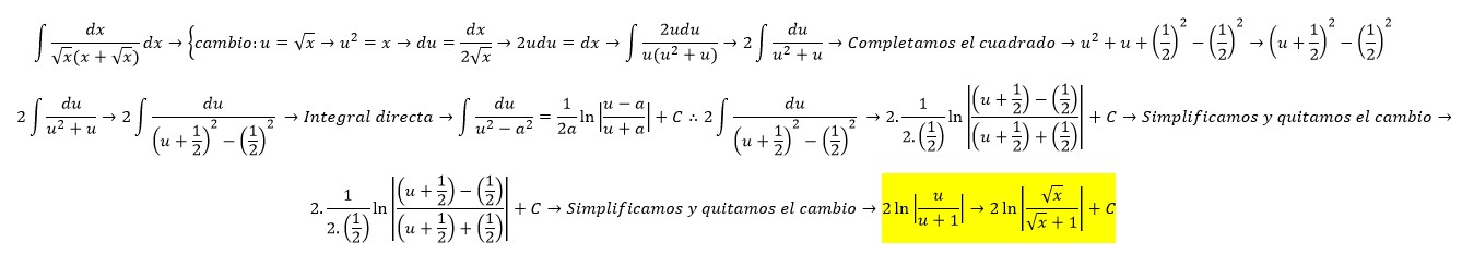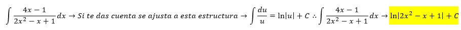 Mira Ariel la estructura que puse era: Si tienes un cociente de Polinomios (du/dx)/u(x) en donde por debajo tengas una función y arriba por suerte su derivada el integrando es el Ln|u(x)|...
