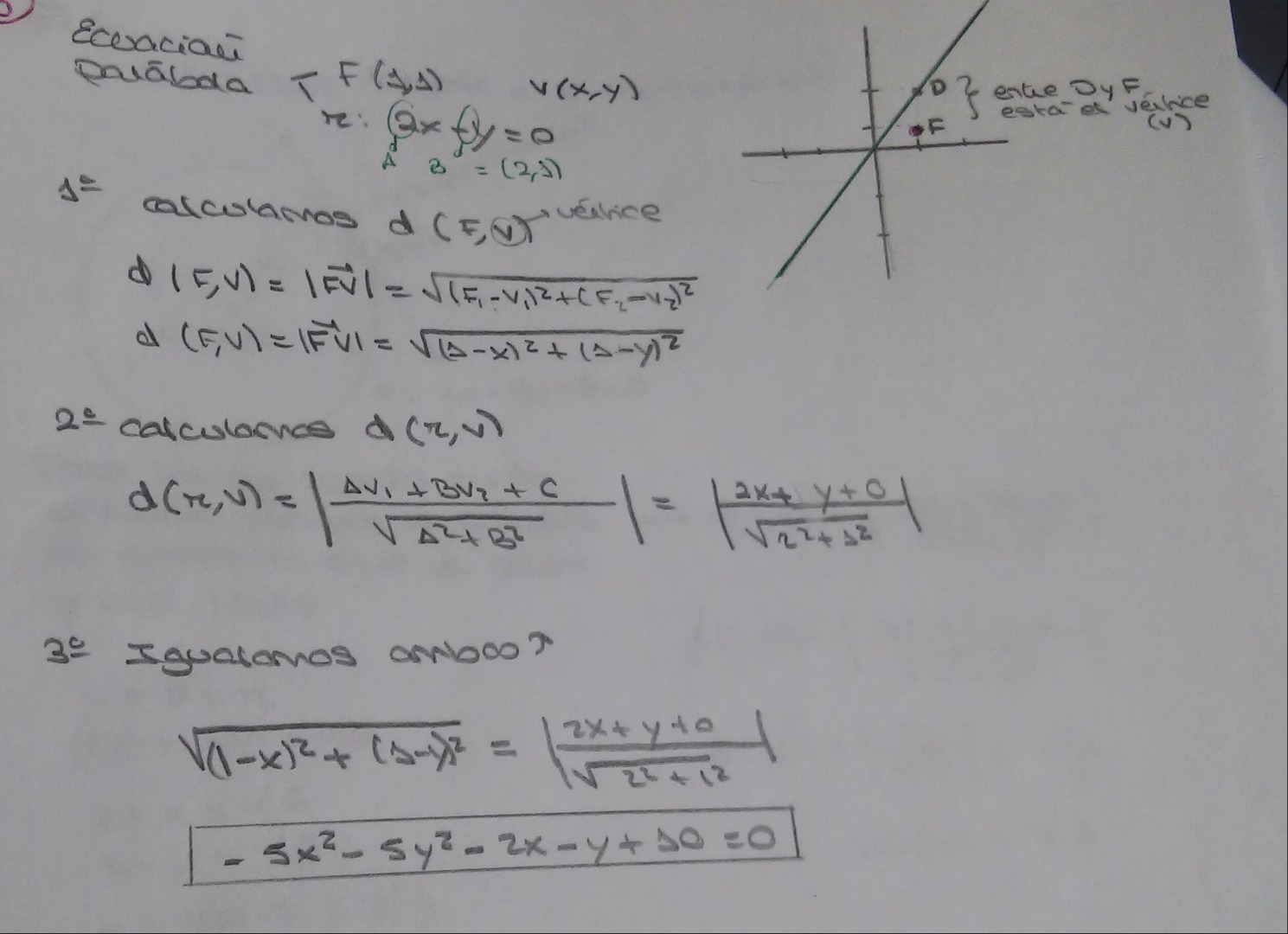 por último, hacemos pasajes de términos y llegamos a la ecuación cartesiana implícita de la parábola: