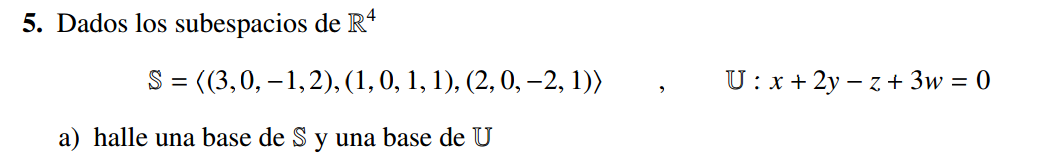 Tengo un problema con este ejercicio. Me pide que halle una base para S y otra para T. Para S no tengo ningun problema ya que busco combinaciones lineales y encuentro el valor que "sobra" por asi decirlo.