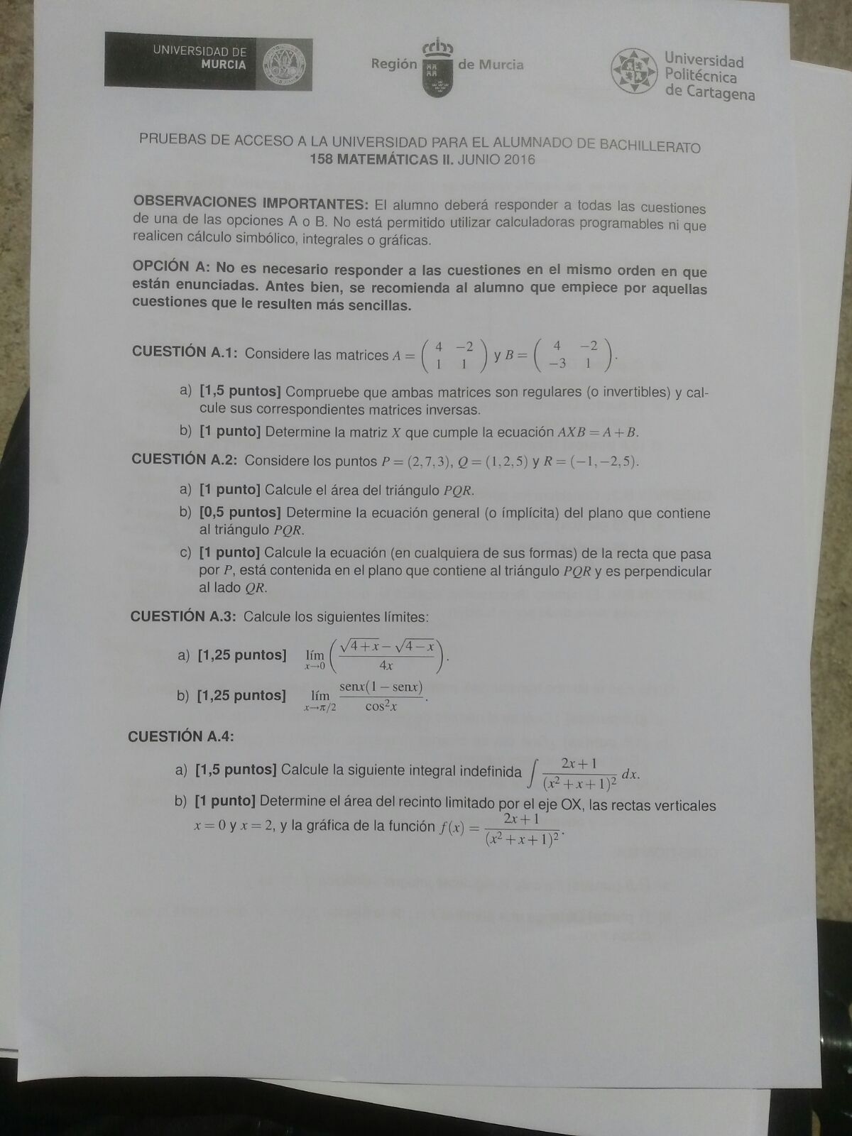 Buenas, ¿Podriais hacer esta opcion de Pau 2016 matematicas II region de murcia? No estoy conforme con el 6 que me han puesto y quería saber si he cometido tantos errores... Muchas gracias:)