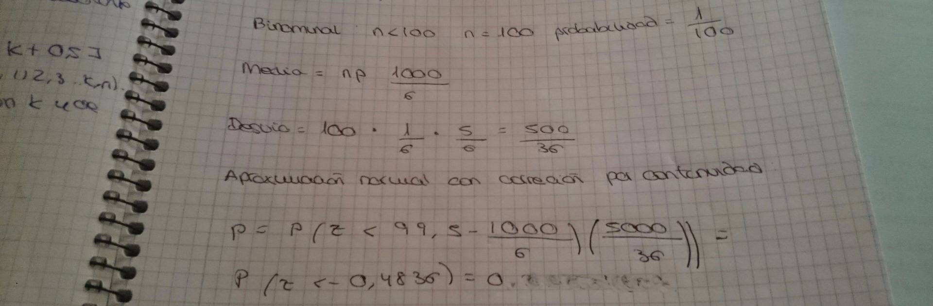 Si lanzamos un dado 1000 veces, ¿cual es la probabilidad de que el número de cincos obtenidos sea menor que 100? Es un problema de primero de bachillerato de distribuciones de probabilidad, y lo he intentado hacer pero es que no me da el resultado correcto y no sé qué más hacer.