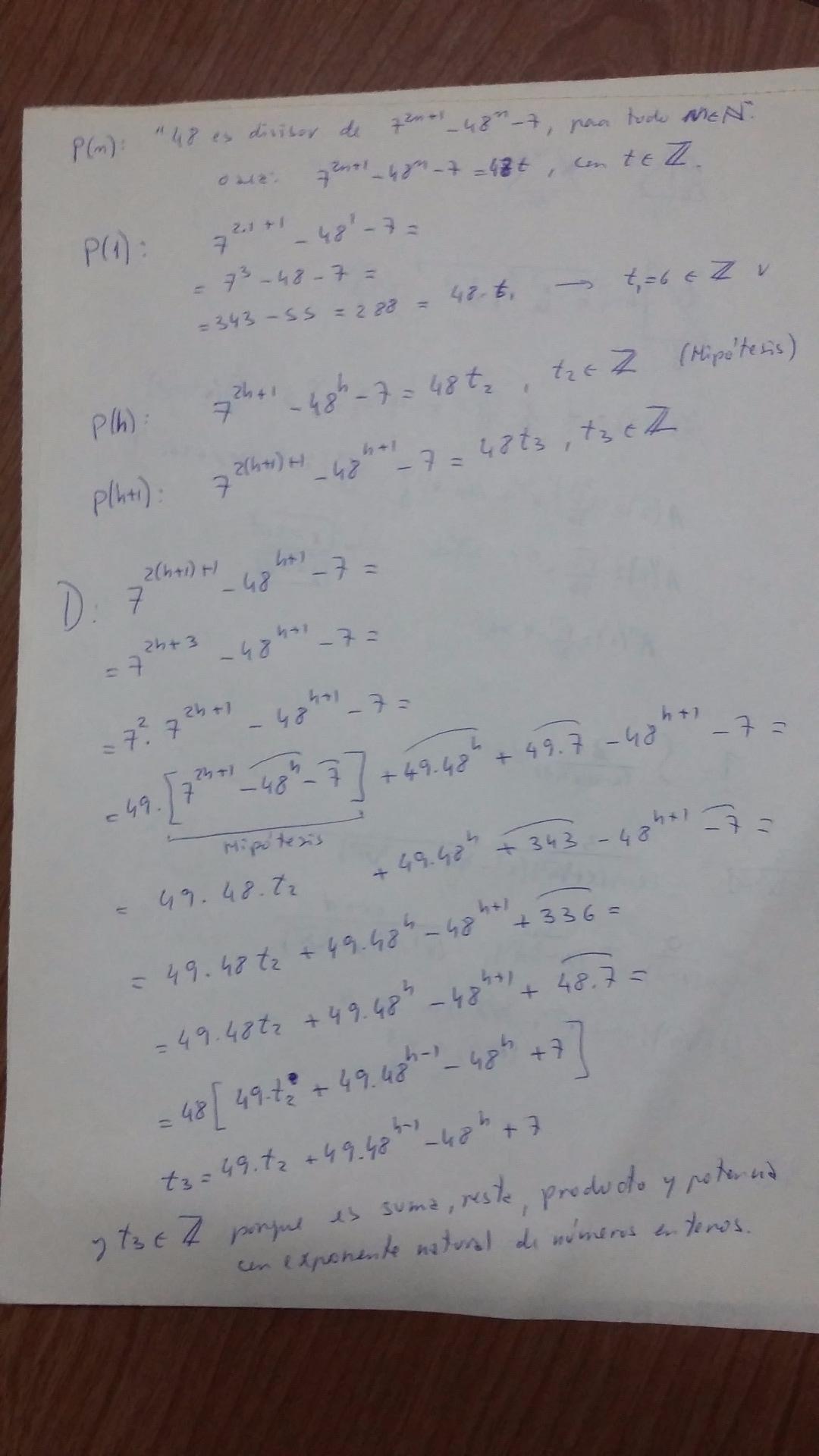 En el paso de demostración, en la cuarta línea, agregamos sumando y restando términos opuestos, a fin de hacer evidente la aplicación de la hipótesis inductiva, y en el cierre, vemos que nos queda un factor que es suma y resta de términos que son todos enteros por propiedades del producto de enteros, y de la potenciación de enteros con exponente natural.