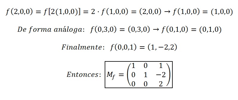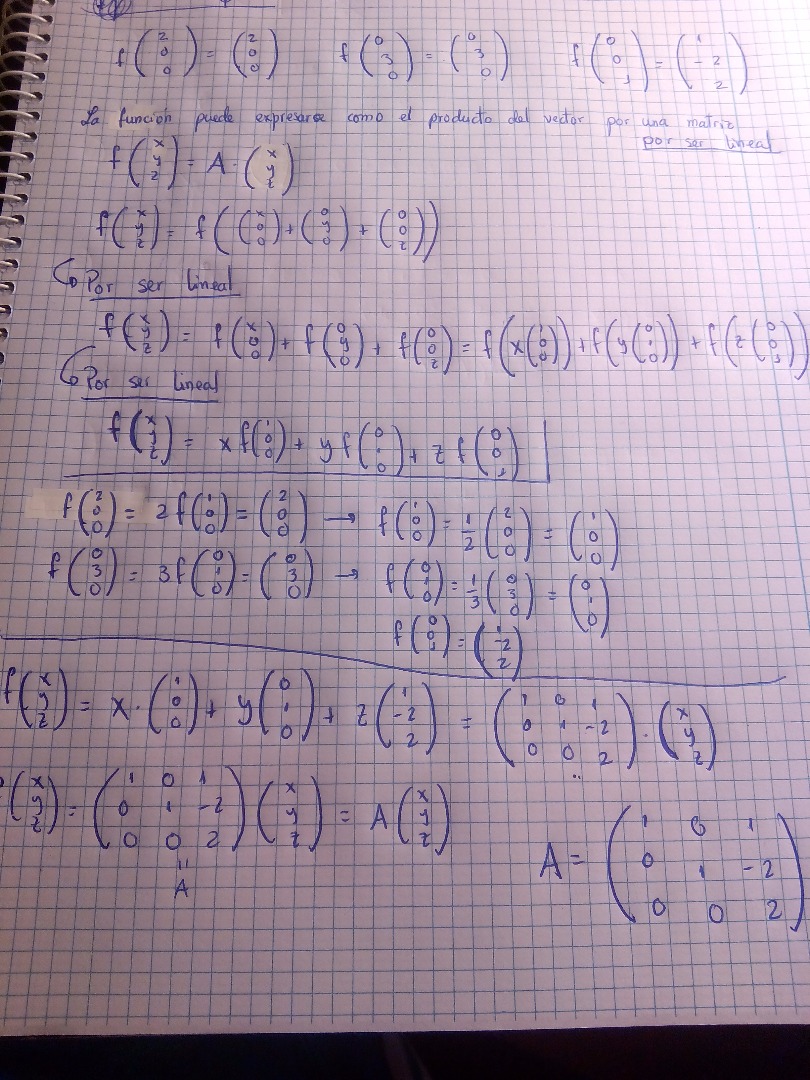 La matriz es una forma de colocar la función si es lineal (se puede colocar como una matriz por el vector a transformar), esta matriz tiene en sus columnas las transformaciones de todos los elementos de la base canónica {(1,0,0);(0,1,0);(0,0,1)}. si es lineal se cumple que f(x1 + x2)=f(x1)+f(x2), y que f(c*x)=c*f(x) (siendo c una constante, c ∈ R).