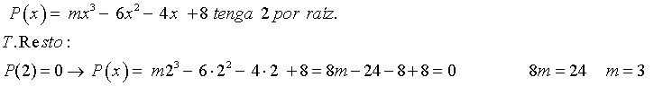 Hola! Necesito ayuda en el siguiente ejercicio. Halla el valor de m para que el polinomio P(x)= mx3 - 6x2 - 4x +8 tenga 2 por raíz.
