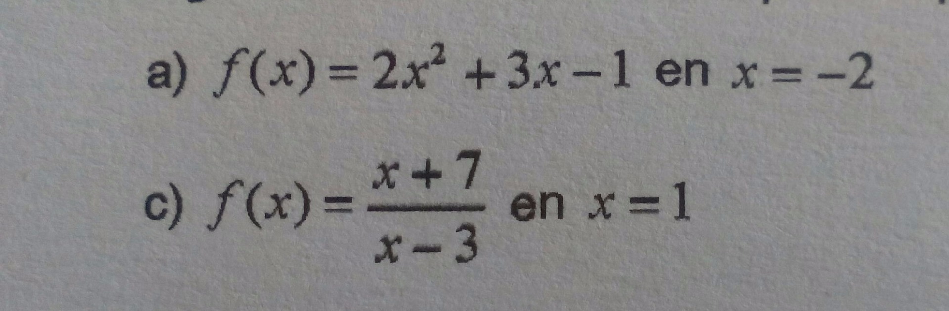 a) 2x²+3x-1 en x=-2 → 2·(-2)²+3·(-2)-1 = 2·4-6-1 = 8-6-1 = 1.