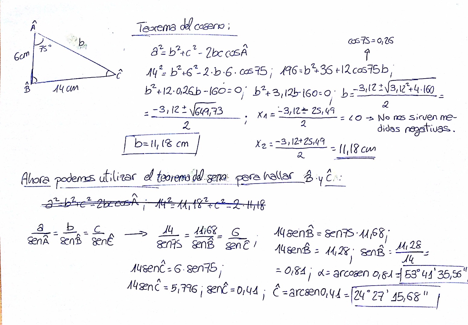 Una vez averiguada, ya puedes recurrir a utilizar el teorema del seno para hallar los datos que te faltan.