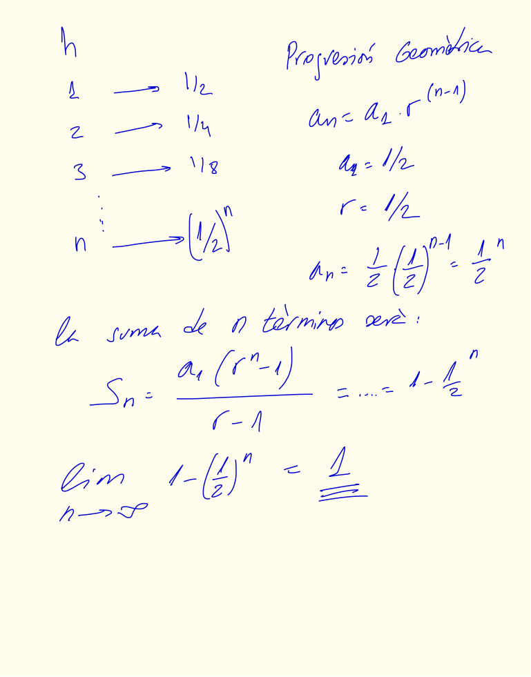 Te paso el planteamiento donde veras la progresión, la suma de los 'n' primeros términos, y como hay que llegar al infinito para cubrir todo el camino.