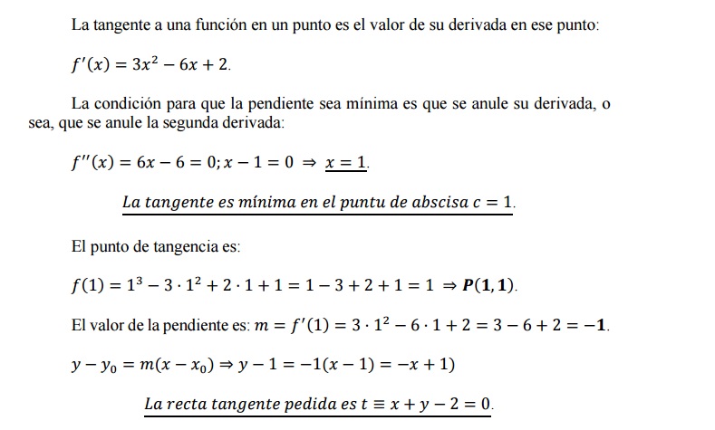 Me pide hallar el valor c que verifica que la pendiente de la recta tangente de f(x) en x=c es minima y que calcule la correspondiente recta tangente de f(x) en x=c.