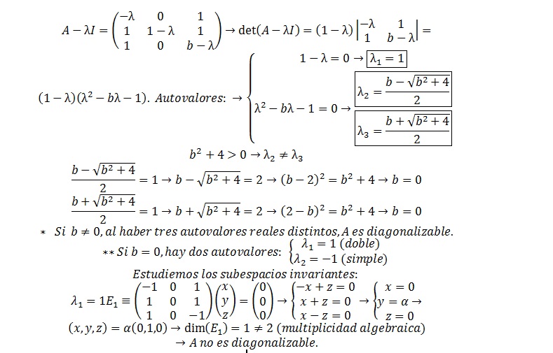 Perfecto, lo que no comprendo muy bien es el porque igualas la solución de lambda dos y landa tres a 1, y por ya preguntar he hecho el apartado b) dándole un valor a b = 3, por lo tanto da tres valores de lambda, se forman las matrices diagonales, y para los vectores propios, la duda que me surge es que si es posible que para los valores de lambda 2 y lambda 3 que son distintos, me salga el mismo vector, el (0,0,0)