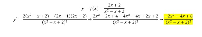 Hola, en el examen de selectividad de 2015 sale que la derivada de esta función 2X+2/x^2-x+2 es -2X^2-4X+6/(x^2-x+2)^2 y no me sale el nominador. A mi me sale -2x^2 + 4x +2 y aplico la formula de derivación en división.