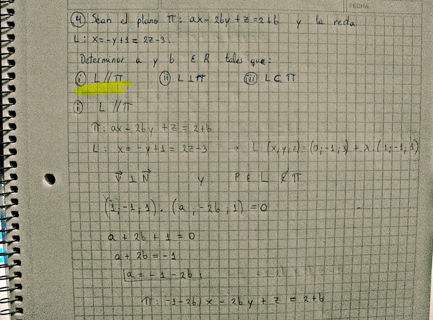me dan una recta y un plano .. con parámetros.. Me piden determinar el valor de 'a' y 'b' para que la recta sea paralela al plano..