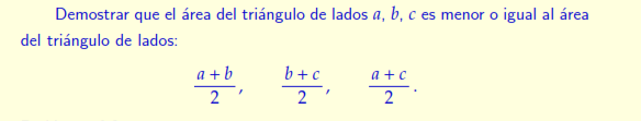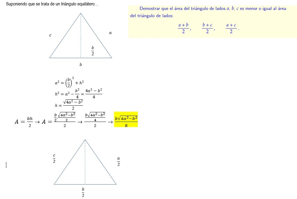Para un triangulo de lados (a+b)/2, (b+c)/2 y (a+c)/2, el area será A'= √[s'.(s'-(a+b)/2)(s'-(b+c)/2)(s'-(a+c)/2)] siendo s'=[(a+b)/2 + (b+c)/2 + (a+c)/2] /2 = [(2a+2b+2c)/2] /2 = (a+b+c) /2 = s