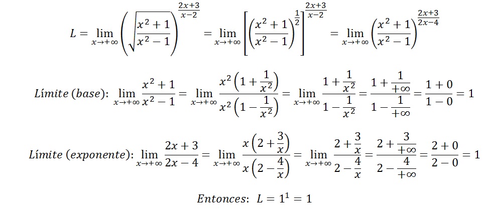 Un límite de f(x) elevado a g(x) es igual al límite de f(x) elevado al límite de g(x). Teniendo esto en cuenta, si te fijas, ves que el límite de f(x) (la raíz cuadrada) te queda infinito partido infinito. Esto es,