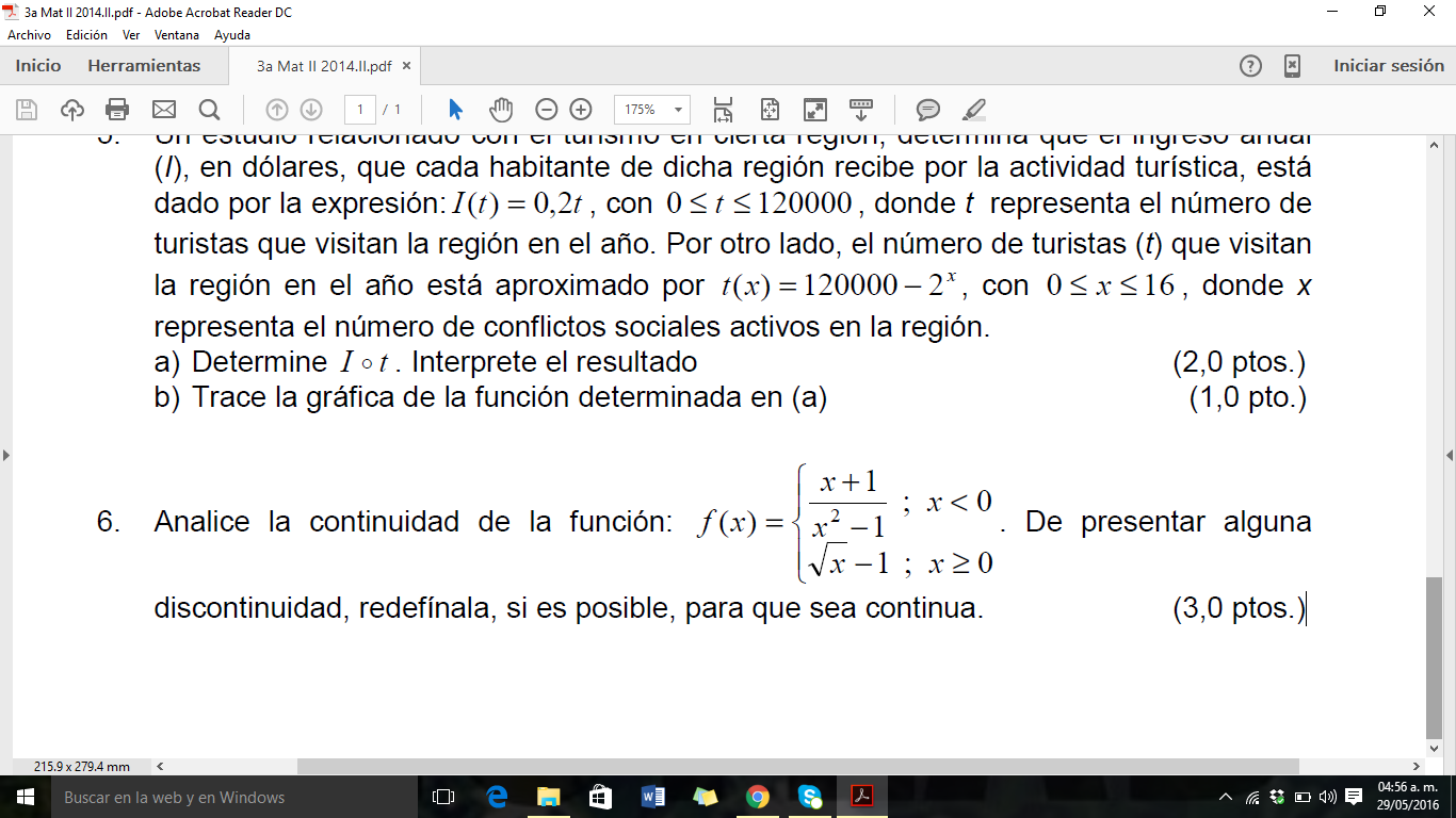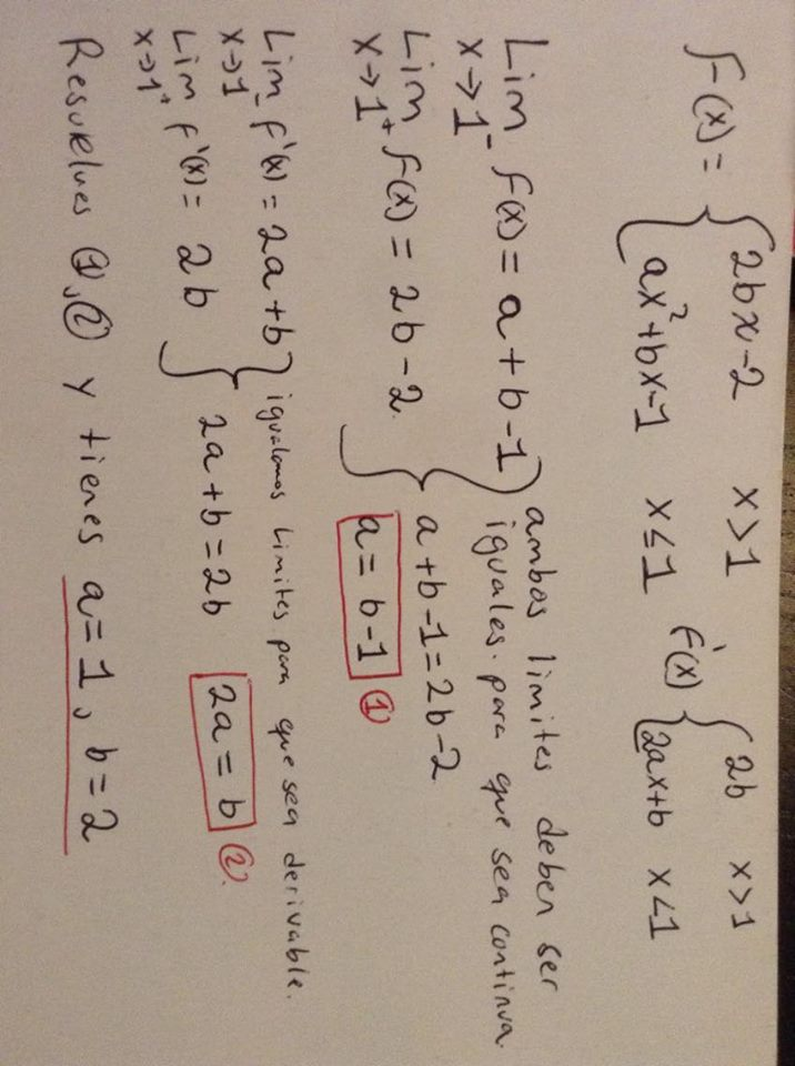 Me podéis ayudar por favor , mañana tengo examen , y hay un ejercicio que no me da el resultado , se trata de hallar a y b para que sea continua y derivable .