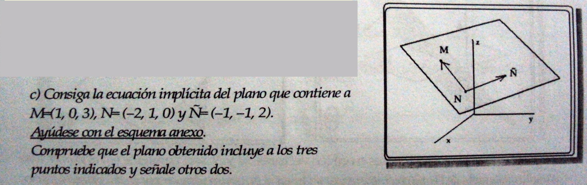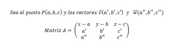 debes tener dos vectores y un punto para poder sacar la ecuación. Tienes tres puntos, de modo que puedes crear los vectores a partir de dos puntos (MN, NÑ, o el que quieras) y luego utilizar uno de esos puntos para obtener la ecuación (debes utilizar los tres puntos de alguna manera). Una vez que tengas eso creas una matriz del estilo que te mando en la imagen, calculas su determinante, simplificas y ya está.