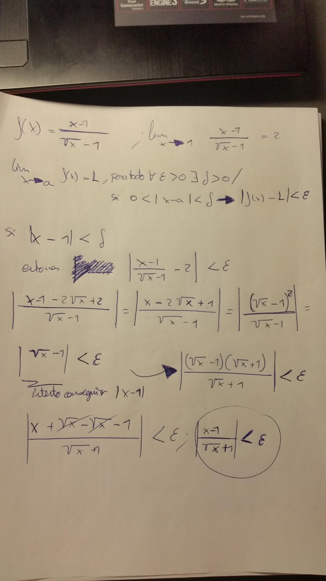 hola David he estado viendo video de confirmar la solución de un límite pero en este ejemplo que tengo no se que hacer cuando llego a la parte que tengo redondeada, se podría pasar la raiz de x mas 1 multiplicando al E y ya esta o como seria. Gracias.