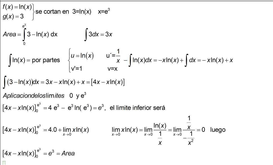 Área de la región del plano donde se cruzan y=ln(x), y=3 y los ejes de coordenadas.