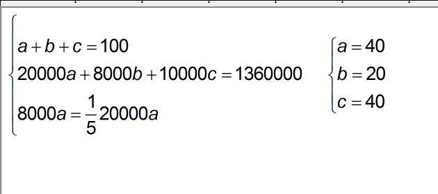 asignas por ejm como numero de cada grupo A , B y C, luego tendrias que A*20000+b*8000+c*10000 =1360000, aqui puedes dividir todo entre 1000 y te queda una ecuacion mas pequeña, y esa seria una ecuacion 20A+8B+10C=1360