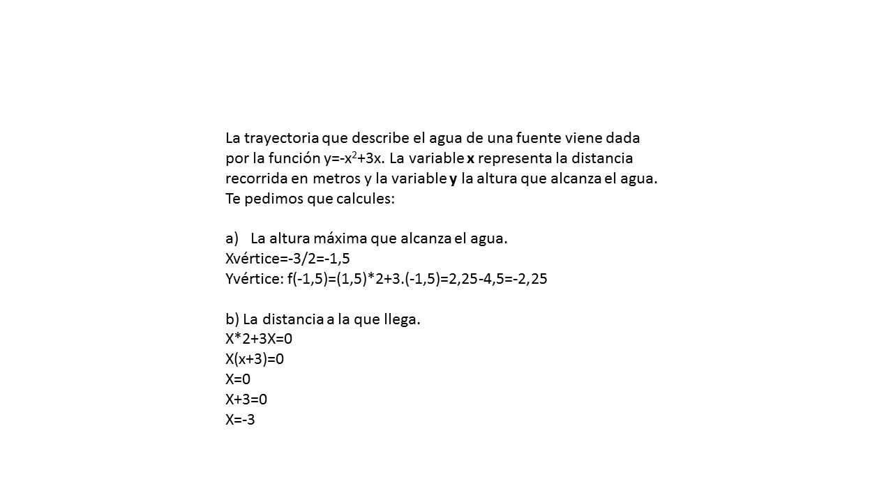 ¡Buenas noches! No consigo ver el error en este ejercicio y sé que está mal. Consiste en un ejercicio de parábola donde hay que calcular la altura máxima y la distancia de la trayectoria que describe el agua.