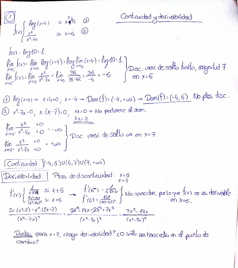 En este ejercicio de estudiar la continuidad y derivabilidad me ha surgido una duda: sé que la derivabilidad se debe hacer en los puntos de cambio de la función, pero, ¿ha de hacerse también en cualquier otro punto de discontinuidad que encontremos? Si fuera así, la derivada por la izquierda y por la derecha sería siempre la misma, haciendo coincidir valores y haciéndola siempre derivable, creo yo. No obstante, me gustaría que me resolvierais esa pequeña duda.