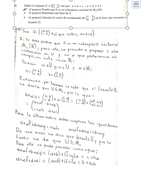 Concretamente mi duda es con respecto al segundo enunciado (Determine una base de U), normalmente sólo tengo que probar que un grupo de elementos dados constituyen una base de un espacio vectorial también dado, pero en este caso, no me dan elementos, así que no estoy seguro de si tengo que proponer un elemento cualquiera o si existe alguna forma de encontrarlo. No encuentro forma de empezar, por lo que me vendría de mucha ayuda una sugerencia o alguien que me pueda pasar un ejercicio similar.