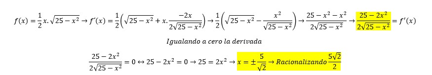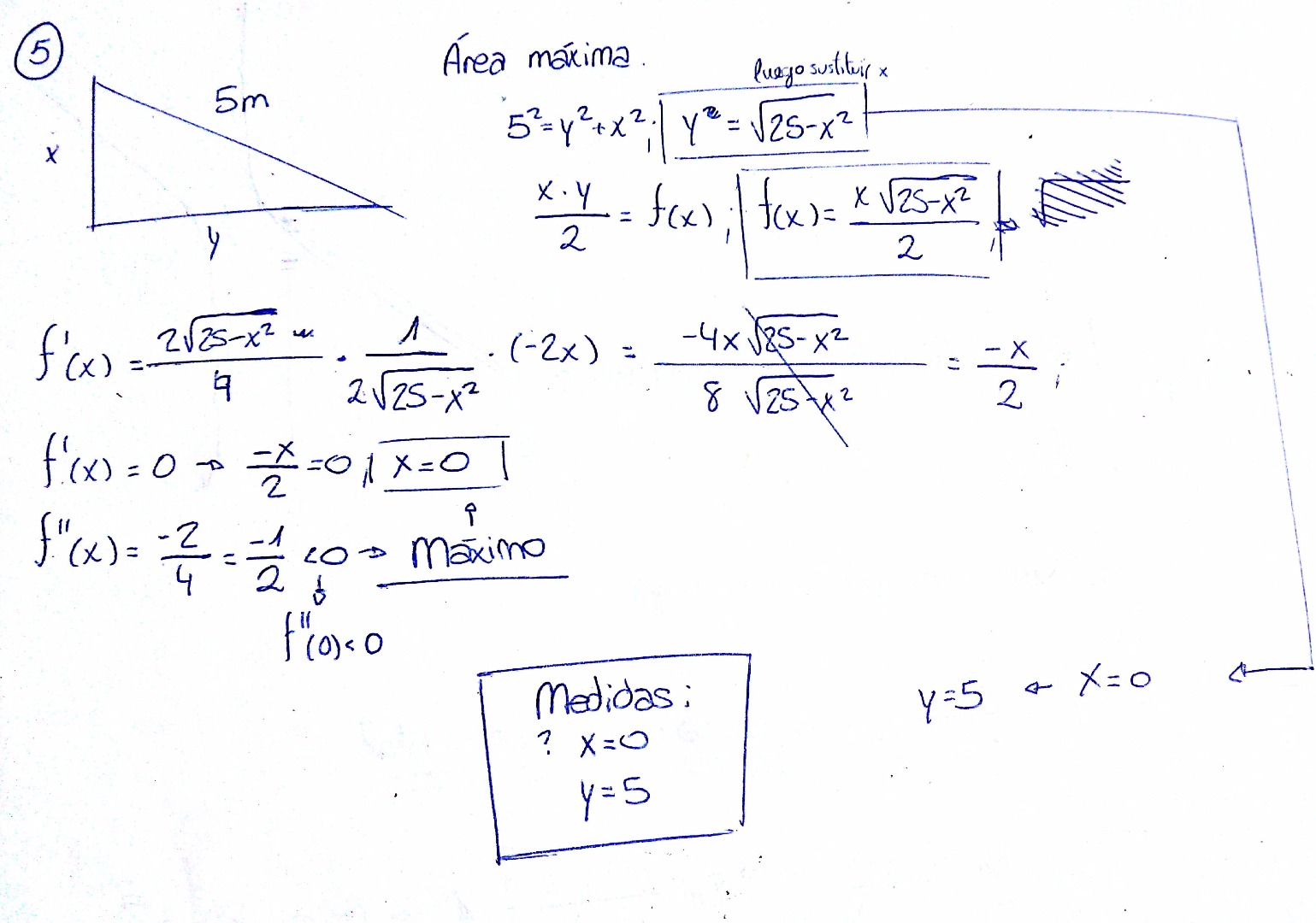 Tengo un pequeño problema con una cuestión de optimización. El enunciado me dice: "de todos los triángulos rectángulos de 5cm de hipotenusa, halla el que tenga el área máxima". En principio, todo ha ido bien: he hallado la primera y segunda derivada sin problemas. El problema está en que una de las medidas me da cero, y eso es, evidentemente a que algo hice mal. ¿Podéis echarle un vistazo al ejercicio y decirme dónde tengo el error? Mil gracias de antemano :).