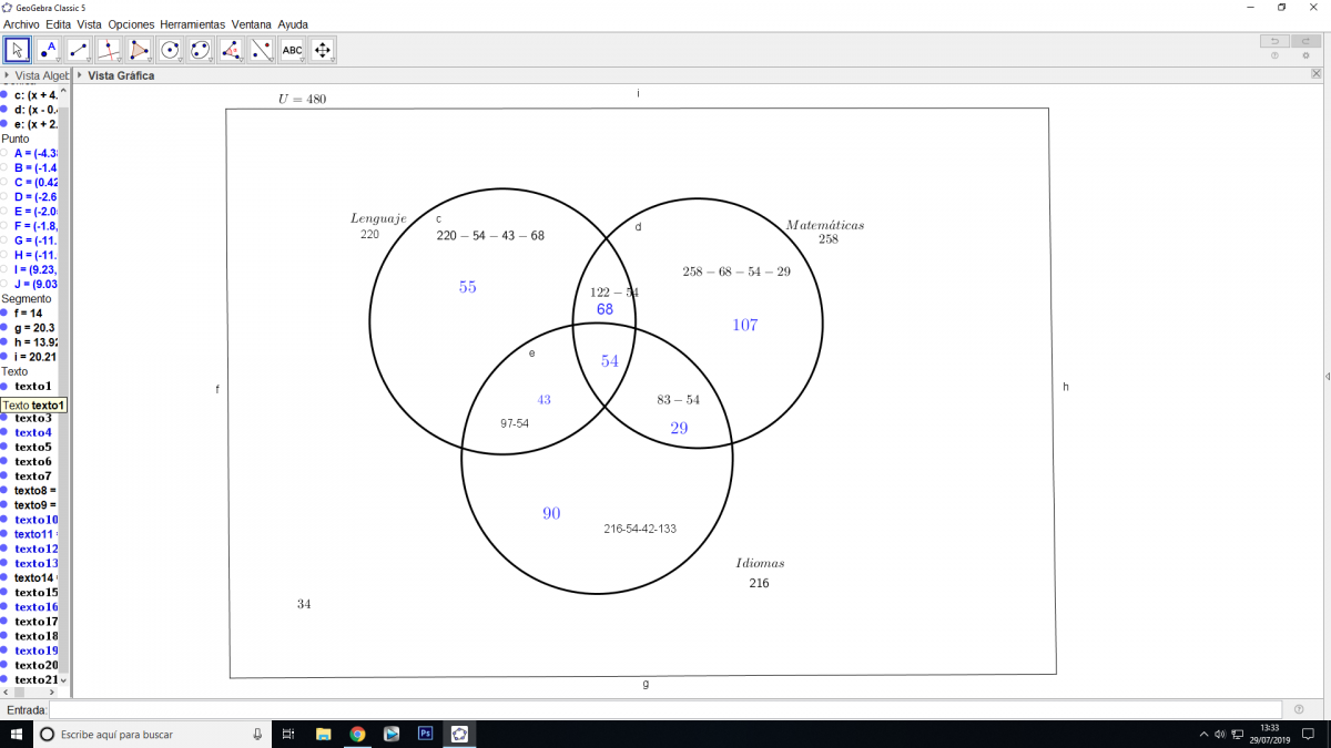 De un grupo de 480 estudiantes, se sabe que 220 tienen habilidades de Lenguaje, 258 tienen habilidades Matemáticas, 216 tienen habilidades con idiomas extranjeros, 122 tienen habilidades en Lenguaje y Matemáticas, 83 tienen habilidades con Idiomas y Matemáticas, 97 tienen habilidades con Lenguaje y con Idiomas, 54 tienen habilidades en las tres áreas. Se elige estudiante al azar de este grupo. Determine la probabilidad de que: Tenga habilidades en Lenguaje y Matemáticas, pero no con los idiomas.