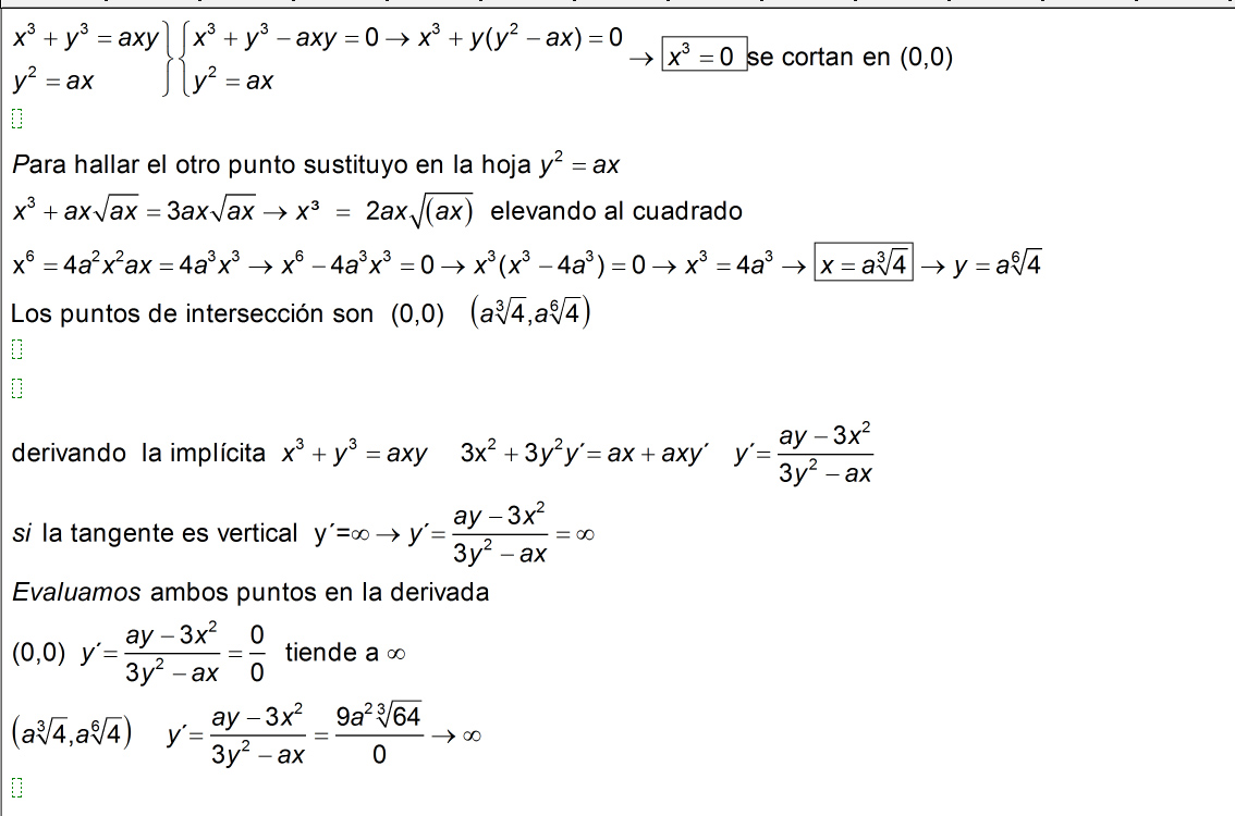 Demuestra que las tangentes a la hoja de Descartes x³+y³=3axy en los puntos de intersección con y²=ax son paralelas al eje de las y