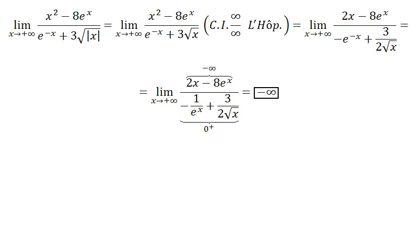 En el denominador hay un infninitésimo (límite cero), que es 1/e^x más un infinito con radical cuadrático. El denominador va, pues, a "más infinito" (pero la raíz de x es un infinitésimio muy lento). Entonces, el cociente: (-∞(/(+∞) va a -∞, porque el infinito de arriba es "infintamente mayor".