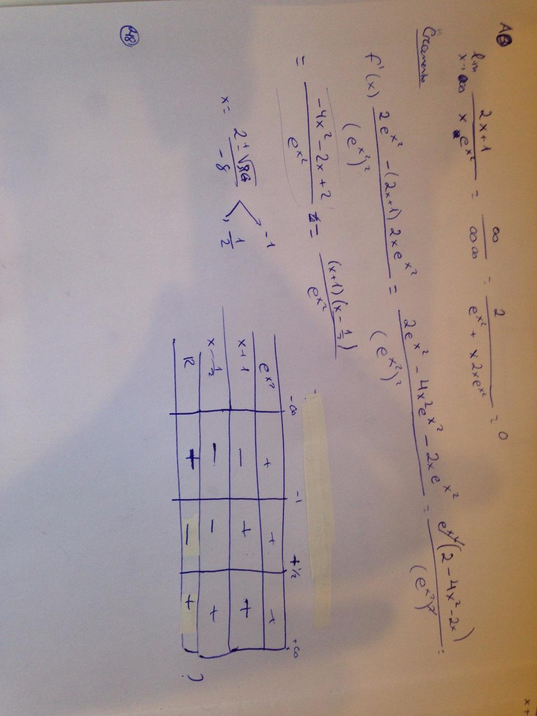 me piden los períodos de crecimiento y decrecimiento de esta función f(x)=(2x+1)/(e^x^2). Al hallar la derivada, factorizo y al hacer la tabla de valores me da distinto a como es realmente.