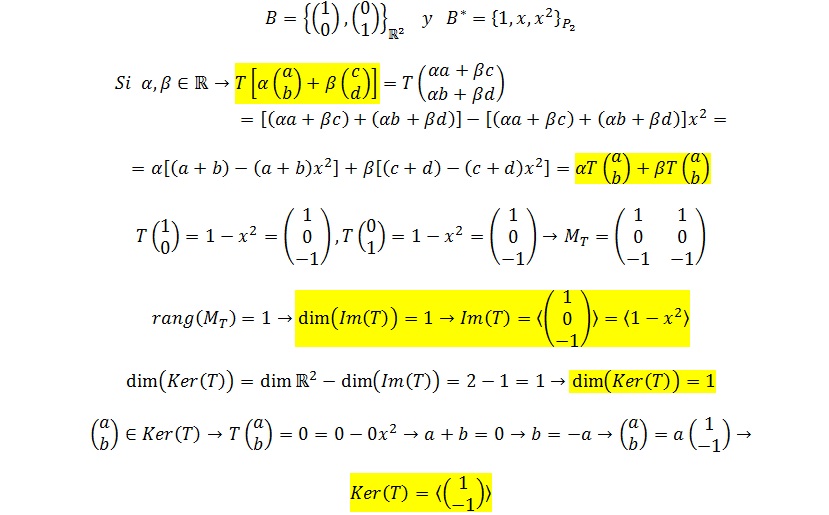 Buenas tardes! Alguien me podría ayudar con este ejercicio? Es que la verdad no estoy segura si el procedimiento para obtener el núcleo y la imagen de una transformación lineal está correcto.