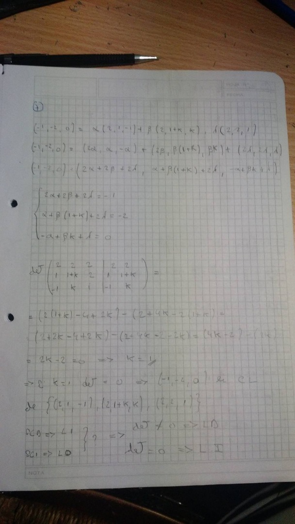 determine todos los valores de k perteneciente a los R para los cuales (-1,-2,0) es combinacion lineal de los vectores del conjunto: {(2,1-1),(1,1+k,k),(2,2,1)}.