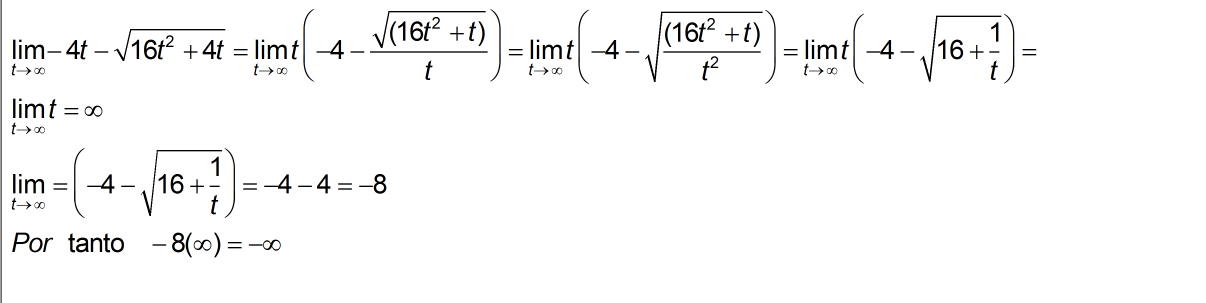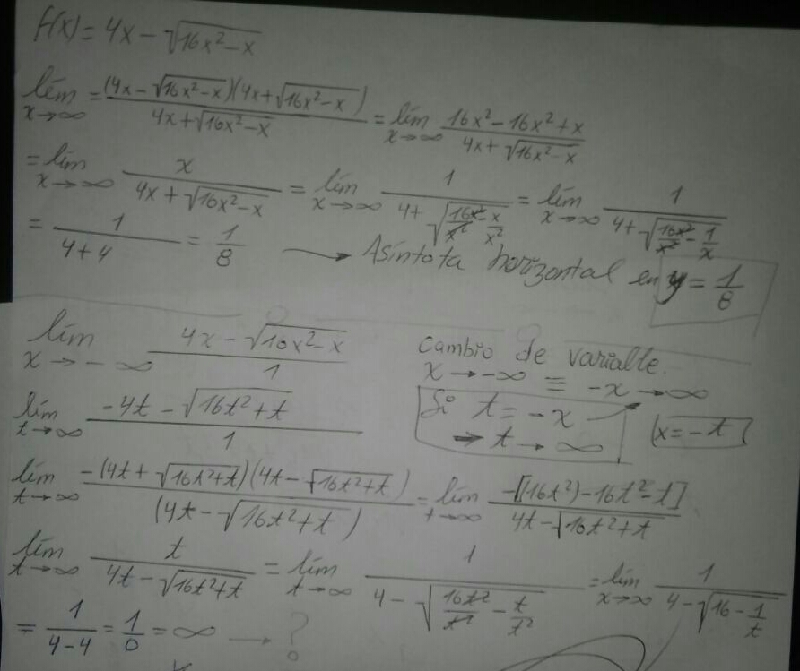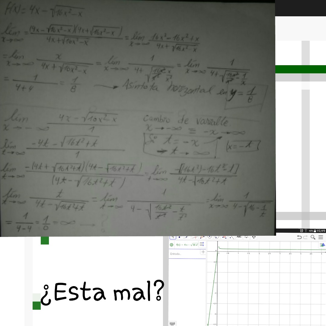 Hola amigos de unicoos , me podrian ayudar corrigiendo el problema de límites, algo me dice que anda mal, al hacer el límite al infinito negativo, me da infinito positivo. ¿Qué esta mal?. En la gráfica se observa que el primer límite coincide con la asíntota horizontal, eso estaría bien. Creo que esta mal el límite cuando x tiende al infinito negativo, xq en la gráfica tiende al menos infinito. Lo hice por cambio de variable. ¿Es posible hacer el límite cuando x tiende al infinito negativo sin hacer cambios de variables? En caso de si haber otra forma, ayudenme también ofreciendome esa información de ayuda. La necesito por que mi profesor ahora esta más exigente que nunca, nos hace realizar un ejercico de distintos métodos y quisiera saber si hay otra forma para que no me traiga sorpresas. Muchisisisisisisisisisimas gracias de antemanos amigos de unicoos y saludos a vuestros equipo. Sois los mejores. Gracias