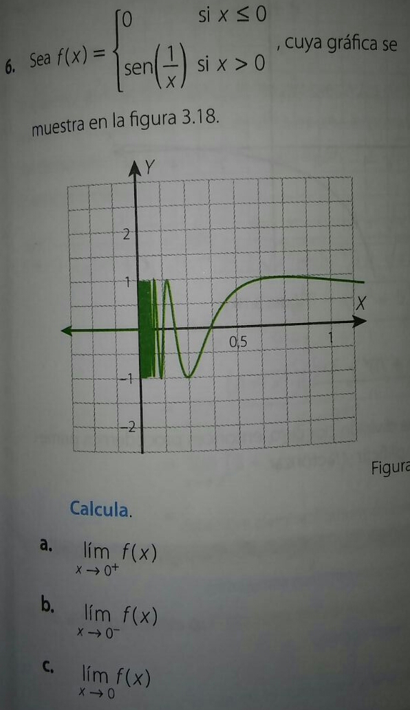 Buenos días Viviana, El límite de la función cuando x--> 0 por la derecha, no existe, pues se trata de una función que oscila, tomando todos los valores entre -1 y 1, incluyendo éstos, pero no converge por la derecha.