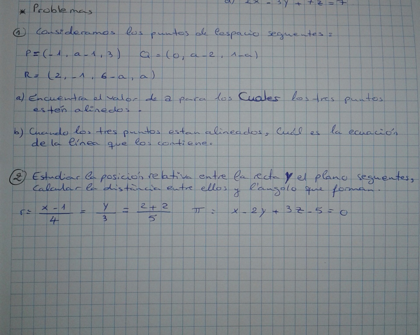 En el 2 ej.: Yo pasaría la ecuación de la recta a general multiplicando en cruz las igualdades (de 2 en 2) y junto con la ecuación del plano haría Teorema de Rouché-Frobenius para sacar la posición.