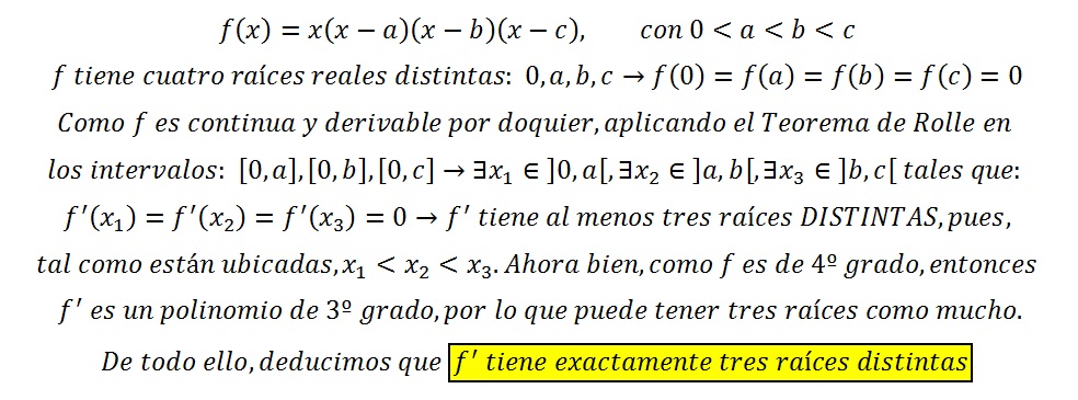 - Supongamos que 0< a< b< c. Demuestra que la ecuación f’(x)=0 tiene, exactamente, tres raíces reales y distintas, siendo f(x) el polinomio de grado 4: x·(x-a)·(x-b)·(x-c).Hay que razonar por qué hay tres y por qué no hay más