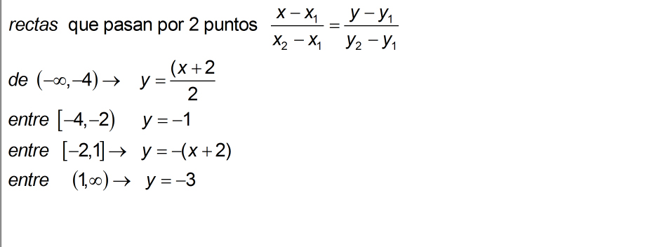 Se trata de una función a trozos, para definirla tienes que ver que funcion se forma a partir de "ciertos x", para tu ejercicio, si, -2 ≤x <1 la función que aparece es f(x)= -2-x , si x≥1 la función que aparece es f(x) = -3 , si , x<-4 esa recta tiene por pendiente 1/2 , si usas la ecuacion punto pendiente ( el punto (-6,-2)) entonces te resulta: