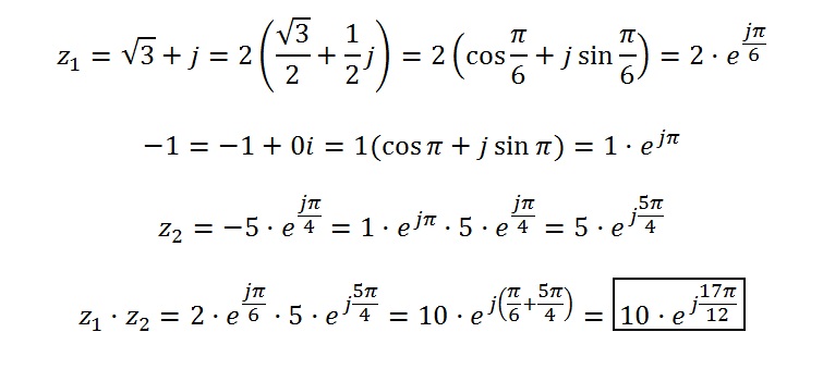 El producto de z=z1.z2, siendo z1=√3 + j y z2= -5.e^jpi/4.