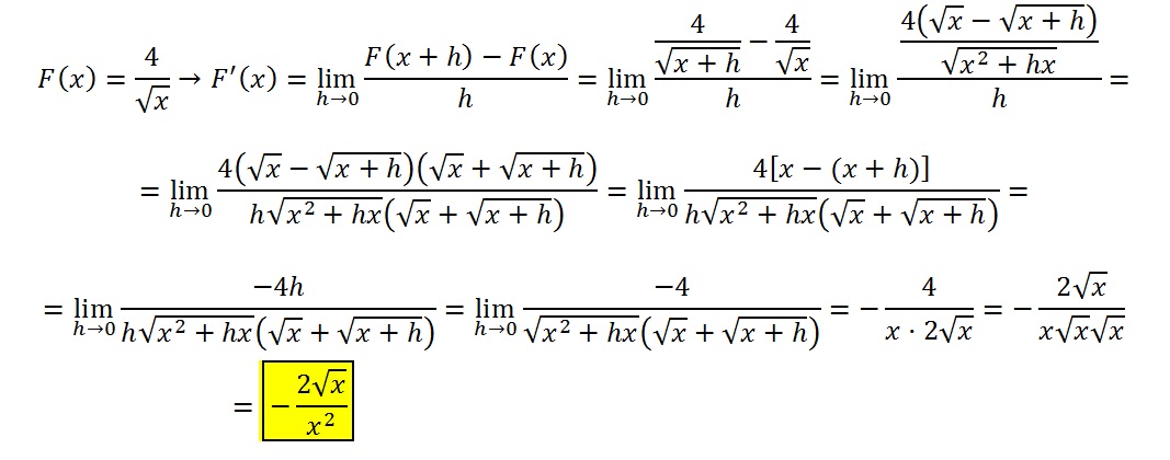 Hola Lovelin, si no quieres hacerla co o la derivada de un cociente, puedes cambiar la función por una equivalencia transformando la raíz cuadrada de x como un exponente de 1/2, es decir laa raíz q de n^p=n^(p/q), y la paso al numerado con su exponente de signo contrario, así f(x)=4(x)^(-1/2). Y ahí puedes derivar como la derivada de un producto f'(x)=y'=(4')(x)^(-1/2)+(4)(x^(-1/2))'=4(-1/2)(x^((-1/2)-1)=4(-1/2)(x^(-3/2))=-2/(x^(3/2)) . O puedes tambier hacer la derivada del cociente. Te recomiendo que escargues de internet un buen texto y mira algunos videos de aquí, o investiga en wikipedia ahí se ven cosas intersantes como su aplicación en otras ciencias.