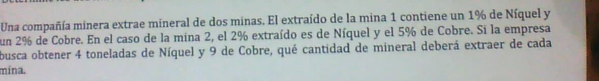 Hola, me pueden ayudar con este problemita. Se trata de sistema de ecuaciones. No se si son dos ecuaciones cada una de cada mina o si son dos ecuaciones con cada mineral en cada una. Gracias