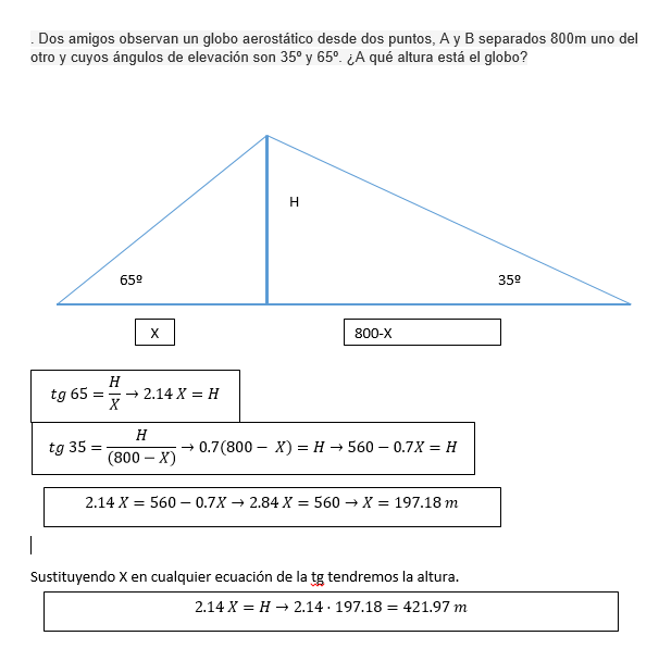 1. Dos amigos observan un globo aerostatico desde dos puntos, A y B separados 800m uno del otro y cuyos angulos de elevacion son 35º y 65º. ¿ Aque altura esta el globo?