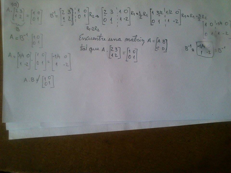 osea es hacer la matriz A, escribirla como general, yo le puse a, al valor A11, Y asi... realiza la multiplicacion de matrices, y te va a dar una matriz con letras y numeros, luego, igualas cada casillero a la matriz identidad, en un sistema de ecuaciones de cuatro ecuaciones con cuatro incognitas, luego podes resolverlo como quieras, o hacerlo triangulando una matriz.-