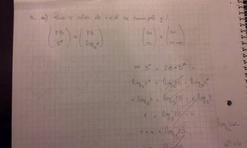 Por un lado, como el numero de "arriba" es el mismo en ambos numeros combinatorios, para que sean iguales podría haberse cumplido para todos aquellos valores de x en los cuales lo de "abajo" fuera igual... por tanto 3^x= log3 x... Por definicion de logaritmos... 3^(3^x) = x... Y no tiene solucion....