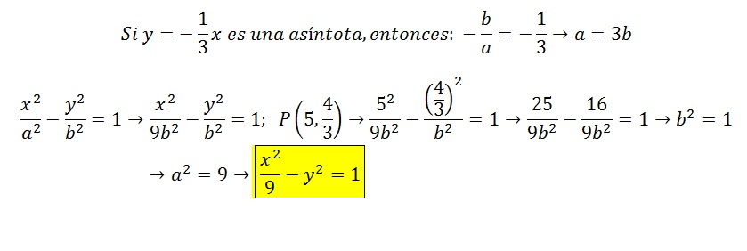Tengo que encontrar la ecucion de la hiperbola sabiendo que pasa por el punto P (5;4/3) que tiene como eje focal el eje ox, y que una de sus asintotas es: y= - (1/3)*x